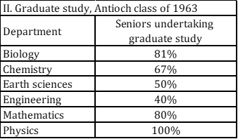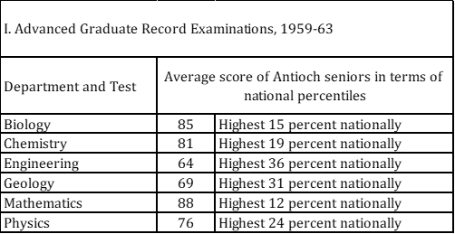 “National studies repeatedly show Antioch to be one of a handful of American colleges that are pre-eminent in producing scholars and that have a contagious intellectual climate. Students come to Antioch capable: 75 per cent of them are in the top quarter of their secondary school classes. They gain substantially in knowledge at Antioch: over the past 5 years, Antioch science and engineering seniors have averaged well above the national mean for seniors taking the Advanced Tests of the Graduate Record Examination (Table I). And three-fourths of those majoring in science and engineering at Antioch go on to advanced study at graduate and professional schools all over the country, usually on scholarships (Table II).14