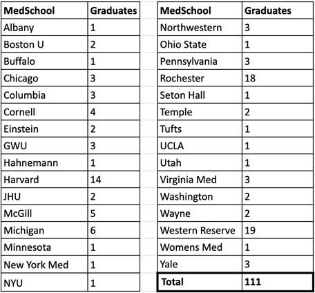 While the development of the program is easy to document from College publications, actual growth of student enrollments and graduations is harder to assess. Chief Federighi kept personal, hand-written records of the graduates who went on to medical schools, although it is not clear how complete these records are. Between 1930 and 1959, he recorded data for 111 graduates enrolling in 31 medical schools; nearly half of all those graduates enrolled at three schools: 19 at Western Reserve, 18 at Rochester, and 14 at Harvard. The Harvard enrollments occurred primarily during the 30s.