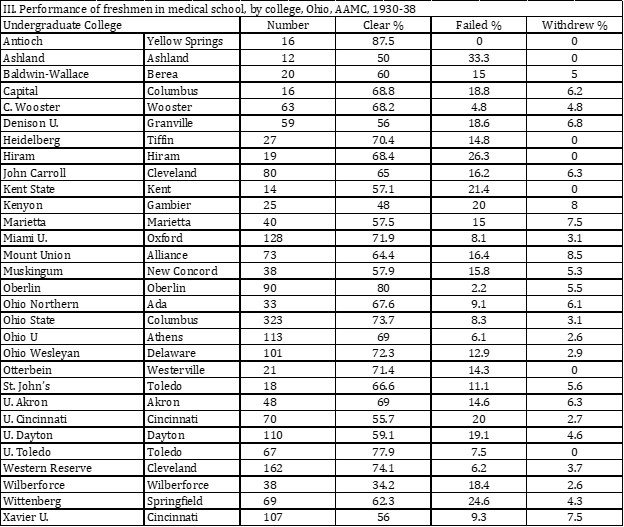 The Federighi archive files have numerous copies of reports from the American Association of Medical Colleges (AAMC), comparisons of Antioch grads’ performance as measured against other colleges, particularly those in Ohio, and other assessments. Table III, also from the AAMC, is based on a nine-year period, 1930-38 and covers all colleges with ten or more students in the freshman classes of U.S. medical schools. The data show numbers of students and, in percentages, those who completed the first year with a clear record, those who failed, and those who withdrew for some reason other than poor scholarship, such as lack of financial support, illness, personal issues, etc.