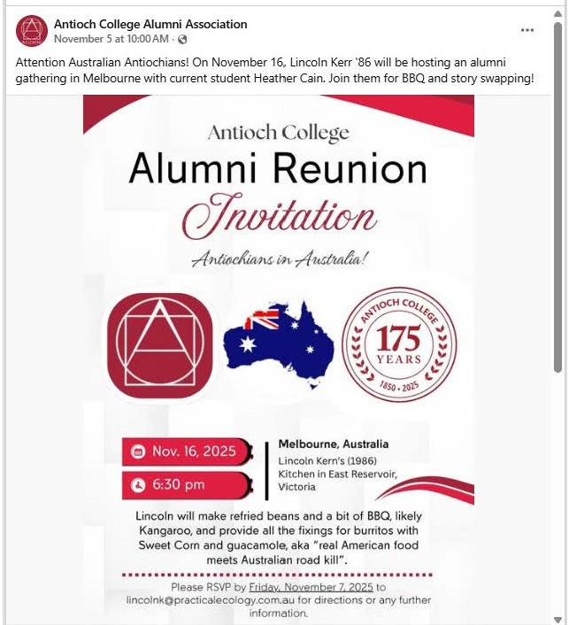 The event happened on the evening of Sunday 16 November 2025. We had “real American food in the form of refried beans and guacamole, made from my lime tree in the front garden, meeting Australian roadkill (actually legally harvested and sold in a supermarket) in the form of marinated Kangaroo skewers.”
