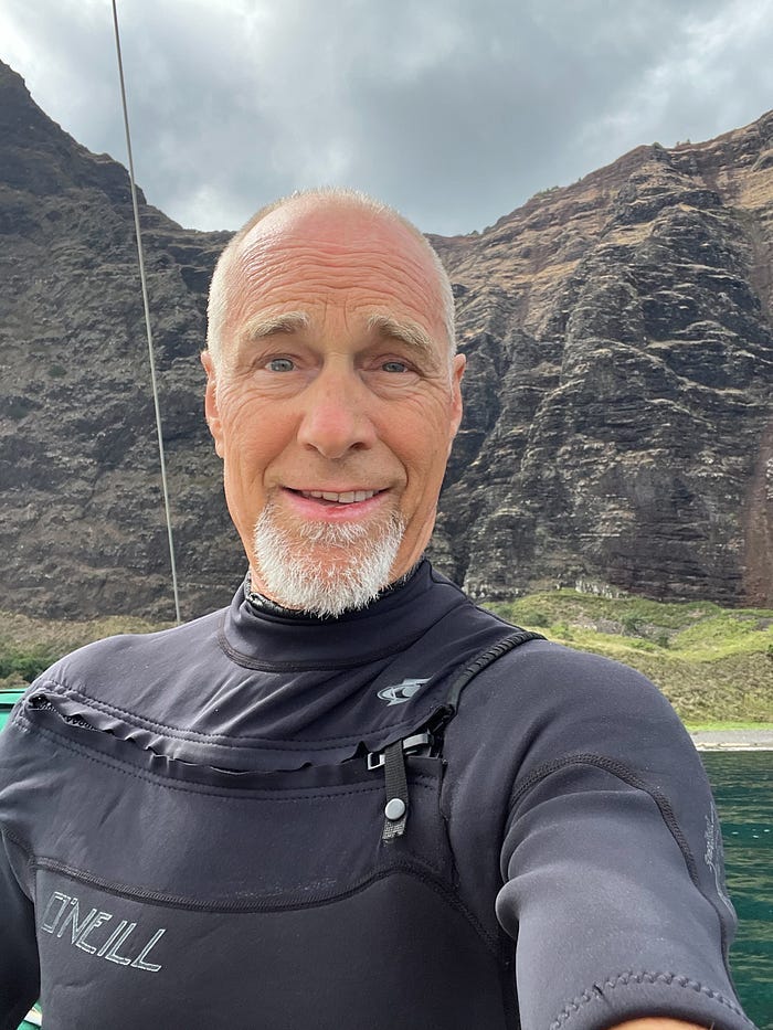 Donn in his wetsuit on Kawaii before scrubbing the bottom of Tao Neutrino