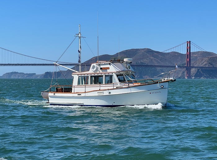 I shut off the engine and let the current gently slide us under the bridge, from the open Pacific into San Francisco Bay. Above us the sights and sounds of traffic crossing the Golden Gate bridge became louder and louder, and soon we were beneath the shadow of the bridge.