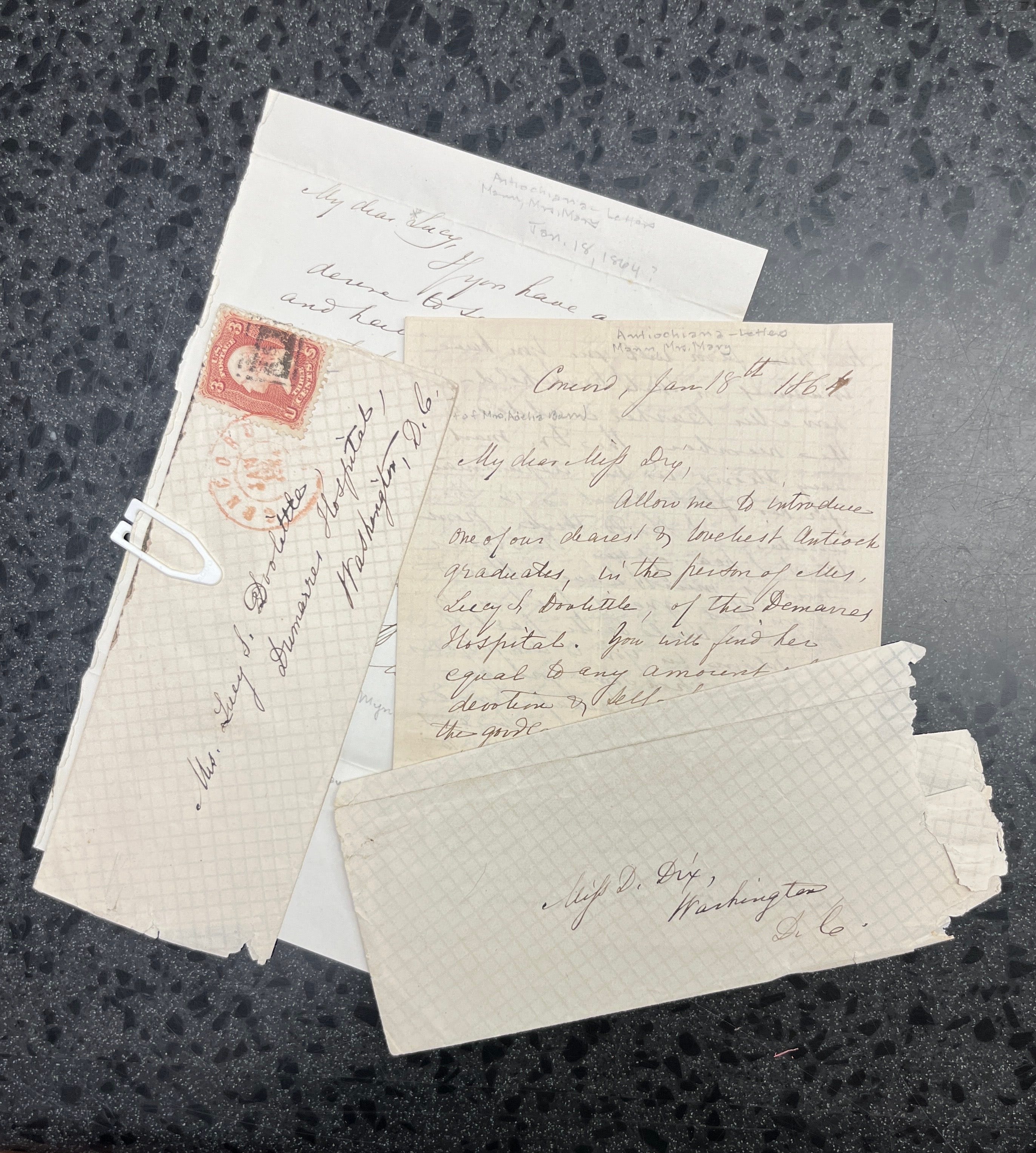 Both letters reside in the manuscript collection known as The Peabody Letters. The bulk of that collection, numbering in the neighborhood of 3,500 pages, was donated to Antiochiana by Robert L. Straker, Antioch College class of 1925. These two, however, came to the department directly from Lucy Doolittle’s daughter, Adelia Doolittle Bauer.