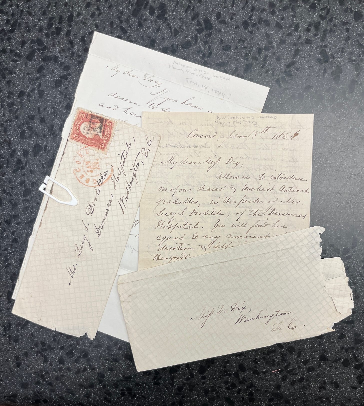 Women of note abound in the following letters by Mary Mann, whose famous husband had been the first president of Antioch College. Here she responds to correspondence from a favorite Antiochian, Lucy Salisbury Doolittle, who by this point has been a nurse in the U.S. Sanitary Commission for about a year caring for the countless sick and wounded soldiers of the U.S. Civil War. Mary is about five years a widow and removed from Yellow Springs for just as long, living in Concord, Massachusetts. The Mr. Doolittle Mary rejoices over is Lucy’s husband Myrick, Antioch College class of 1862, who has just landed a job with the U.S. Naval Observatory. The Mrs. Caldwell she asks Lucy about is Rebecca Wilmarth, former instructor in the Antioch Preparatory Department, a sort of high school designed to prepare prospective undergraduates for the rigors of college. Her husband, Dr. George Caldwell, had previously held a faculty position at the College as a professor of several sciences, but has since moved on to Cornell where he would stay 45 years and develop a national reputation as an agricultural chemist. William Henry Channing is a family friend of the Manns and a prominent Unitarian minister. His uncle William Ellery Channing was a hero of Horace’s and America’s preeminent liberal theologian of the early 19th century.