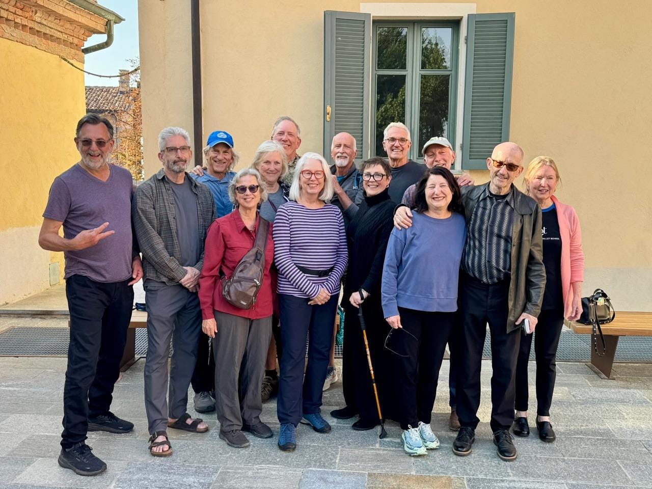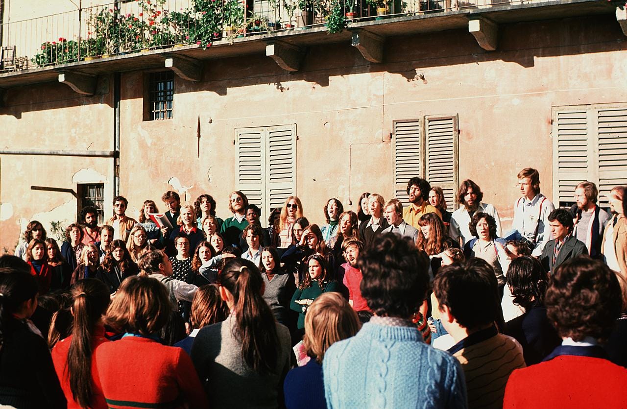 The 1975 Antioch College European Chorus Tour alumni in the same La Morra elementary schoolyard as the archival photograph above, 50 years later.