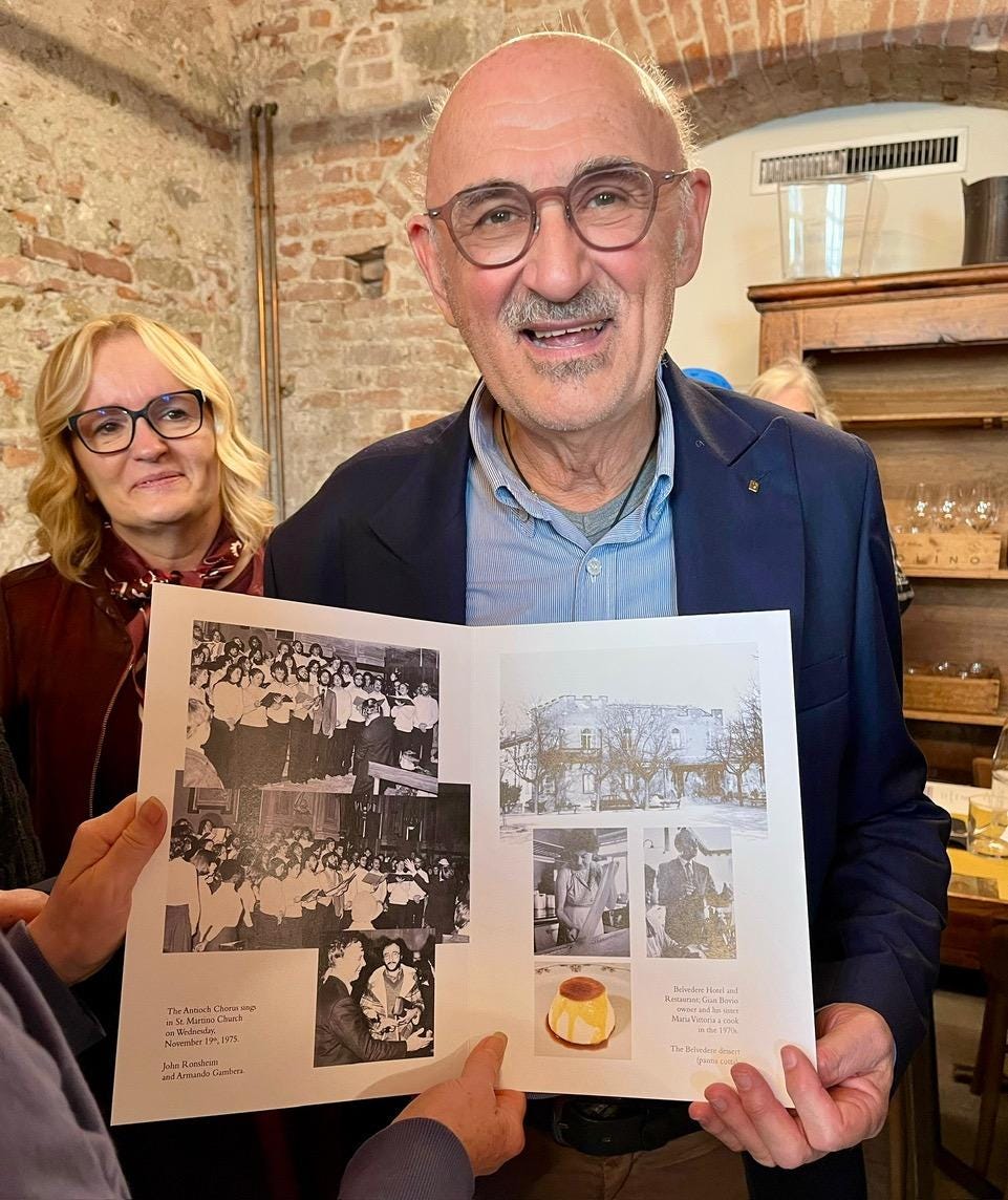 At each place setting on our tables was a commemorative booklet. This booklet was created by Signor Gambera, who we discovered had helped John bring us to La Morra in 1975 when he was just 26 and head of the cultural organization Pro Loco. In the booklet were photos of the chorus singing mass in San Martino, Armando and John conferring, GianFranco Bovio and his mother in the kitchen of their restaurant — and their famous crema caramello, which we all remembered to this day! He was helped in creating this beautiful gesture by the Bovio family, the Cordero family and the mayor of La Morra. This thoughtful ceremonial welcome came as a complete surprise to us. We were all stunned and very moved, some of us to tears.