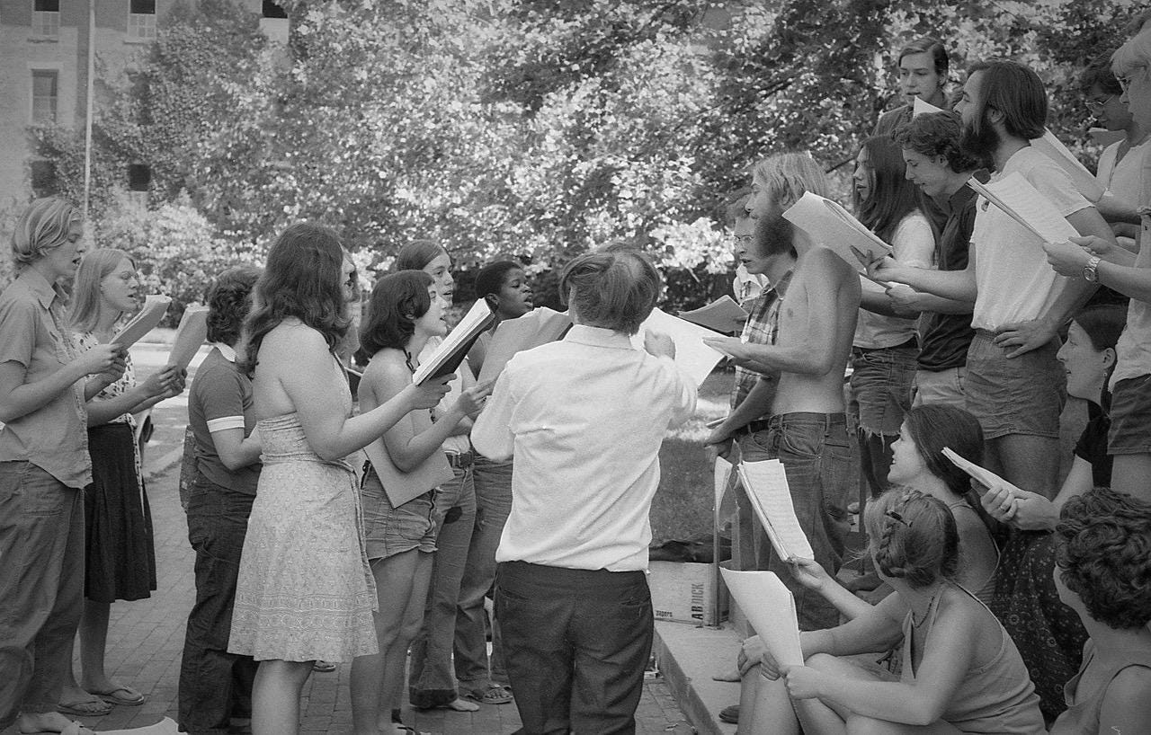In 1972, John Ronsheim, Professor of Music at Antioch College (from 1967-1990) — a visionary, eccentric, impish, brilliant twelve-tone composer with a passion for 15th Century Flemish Renaissance choral music — had an idea, one that made liberal use of Antioch’s propensity for freestyle education. “Almost every time I rehearsed the chorus,” he would later write, “I threw out the sentence, ‘We should perform these works in the places where they were first performed in Europe’.”