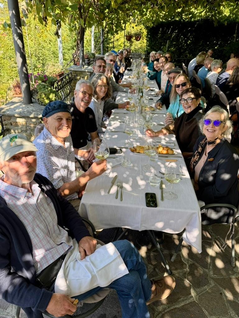 After our tour of the winery and formal private tasting of two Barbarescos and a Langhe Nebbiolo we made our way outside of town to the almost hidden on a hillside, Ristorante Rabayà, for pranzo, our main midday meal. Seated outdoors together at one long table under a grape arbor looking out over vineyards, we shared bread and wine, some of us including a shaving of newly foraged white truffles on the pasta course, filling the air with their pungent and indescribable aroma of earth and fungus. We shared stories of our families and travels and memories of Antioch as the food and wine became the catalyst for fellowship and community and the enjoyment of the art of life, just as John had emphasized to us during our intensive studies of music, fine art, cuisine and wine.