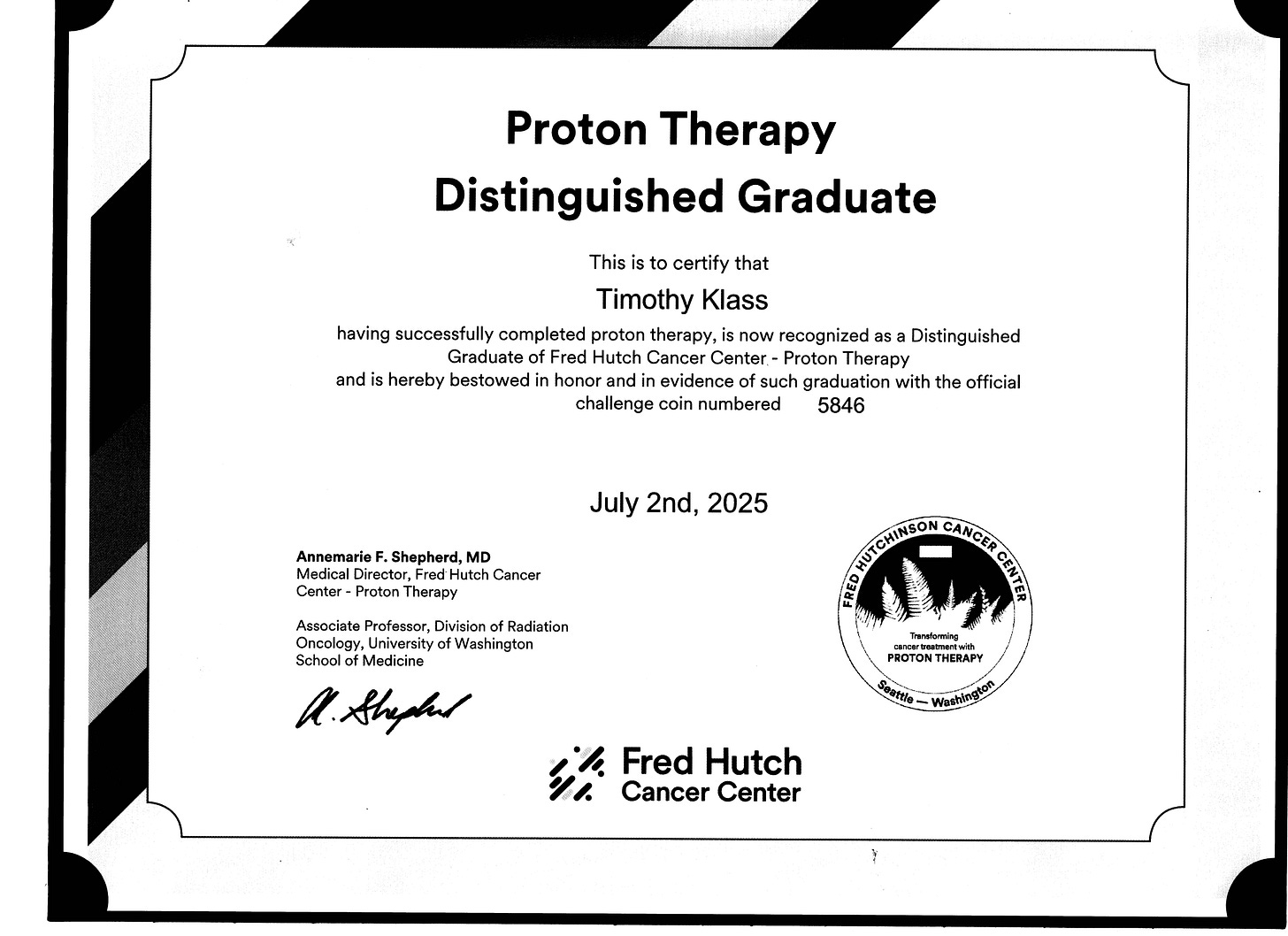 On July 3, Tim Klass '71 reports that he was presented a "distinguished graduate” certificate from the proton treatment center of the University of Washington-Fred Hutch Cancer Center in Seattle. Makes me the center's 5,846th patient to complete proton treatment, in my case 15 sessions of lying on a cold gurney and getting zapped with positive beams of energy for about 20 minutes each. In six weeks I get an MRI to see if I still have any trace of cancer from a liver tumor. Before then, I eagerly anticipate the birth of a second grandchild. Life goes on.